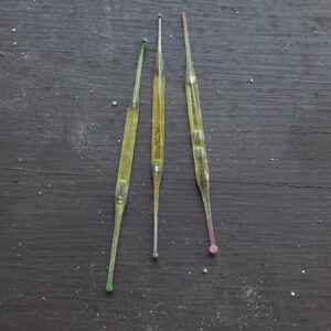 I found little glass tubes about 2 inches long, filled with liquid and featuring a colored glass ball at both ends.