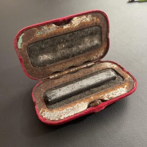 I found this in the house I moved into; the bottom block is a type of metal, and the case is a red flocked clamshell. Vintage hand…