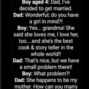 A 4-year-old boy said to his dad, “I’ve made up my mind; I’m going to get married.” Boy’s Big AnnouncementA 4-year-old boy excitedly told his dad, “Dad,…
