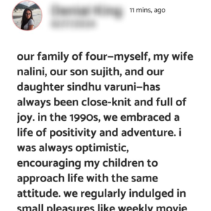 CHERISHING FAMILY MEMORIES AND ACHIEVEMENTS, Our family of four—myself, my wife Nalini, our son Sujith, and our daughter Sindhu Varuni—has always been close-knit and full of joy….