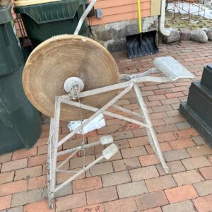 Can anyone identify this? I’m at a holiday cottage, and this is in the garden. It’s mostly metal, has a pedal attached to a large cog with a bolt above it, and looks very old