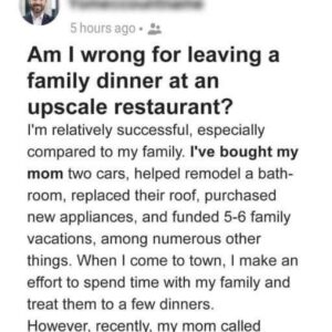 Am I wrong for leaving a family dinner at an upscale restaurant? Am I wrong for leaving a family dinner at an upscale restaurant? We frequently find…