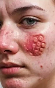 1. A girl with a clear acne on her face 2. A person has an acne on his neck 3. Similar acne in a neck as above…
