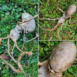 A woman discovered a strange object in her backyard that had everyone scratching their heads. The item, with an oblong skull-like shape, a narrow torso, and reed-like…