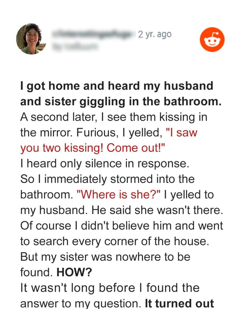 Fury bubbled up inside me like a volcano, hot and fierce as I threw open the door and confronted my husband and sister. “I saw you two kissing! Come out!” I demanded, my voice trembling with anger.