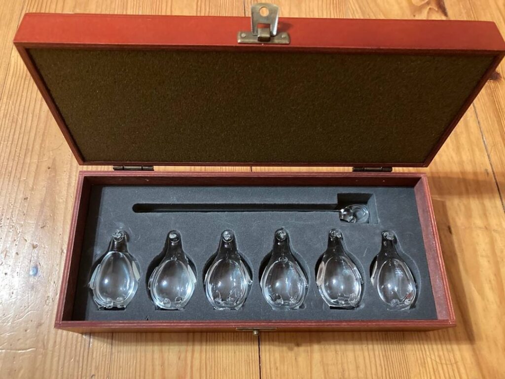Came across this glass set in the attic. The figurines contain a liquid inside. The whole box weighs approximately 500 grams.