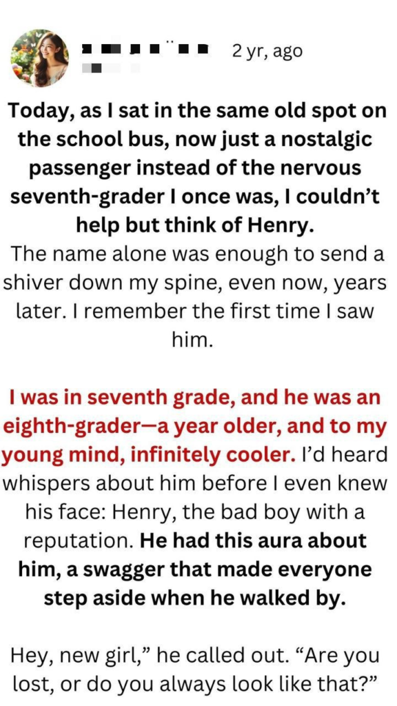 Henry. The name alone was enough to send a shiver down my spine, even now, years later. I remember the first time I saw him. I was in seventh grade, and he was an eighth-grader—a year older, and to my young mind, infinitely cooler. I’d heard whispers about him before I even knew his face: Henry, the bad boy with a reputation. He had this aura about him, a swagger that made everyone step aside when he walked by.