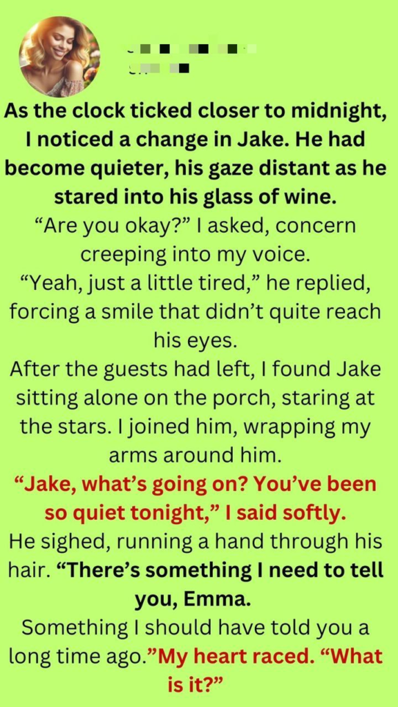 After the guests had left, I found Jake sitting alone on the porch, staring at the stars. I joined him, wrapping my arms around him.“Jake, what’s going on? You’ve been so quiet tonight,” I said softly.He sighed, running a hand through his hair. “There’s something I need to tell you, Emma. Something I should have told you a long time ago.”My heart raced. “What is it?”He took a deep breath, his hands trembling slightly. “I’ve been keeping a secret from you. Something that could change everything.”