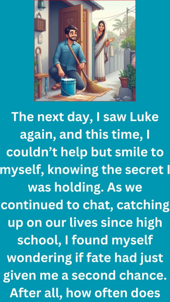 vThe next day, I saw Luke again, and this time, I couldn’t help but smile to myself, knowing the secret I was holding. As we continued to chat, catching up on our lives since high school, I found myself wondering if fate had just given me a second chance. After all, how often does your childhood crush move in right next door?