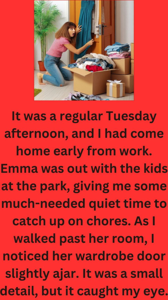 It was a regular Tuesday afternoon, and I had come home early from work. Emma was out with the kids at the park, giving me some much-needed quiet time to catch up on chores. As I walked past her room, I noticed her wardrobe door slightly ajar. It was a small detail, but it caught my eye.