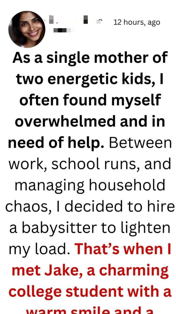 As a single mother of two energetic kids, I often found myself overwhelmed and in need of help. Between work, school runs, and managing household chaos, I decided to hire a babysitter to lighten my load. That’s when I met Jake, a charming college student with a warm smile and a natural way with children.From the moment he walked through the door, I could see the instant connection he had with my kids. They adored him, and I felt a wave of relief wash over me as I watched him engage with them. He played games, helped with homework, and even made dinner. I was grateful to have found someone who could make my life a little easier.As the weeks went by, I found myself looking forward to Jake’s visits. He was not only great with the kids, but he was also kind, funny, and easy to talk to. We shared stories about our lives—his aspirations, my challenges as a single mom—and I began to see him as more than just a babysitter.One evening, after the kids had gone to bed, Jake and I sat on the couch, sipping tea and laughing about the day’s antics. I felt a flutter in my chest as our eyes met, and I realized I was drawn to him in a way I hadn’t expected. He was young, vibrant, and had a zest for life that reignited something in me.But as our connection deepened, I felt a pang of uncertainty. Was it appropriate to develop feelings for someone who worked for me? I worried about the implications of mixing my personal life with my responsibilities as a mother.Despite my reservations, I couldn’t deny the chemistry between us. As I navigated the complexities of my feelings, I knew I had to make a choice: embrace this unexpected romance or keep my heart guarded. The unexpected babysitter had turned my world upside down, and I was left wondering if love could truly blossom in such an unconventional situation.