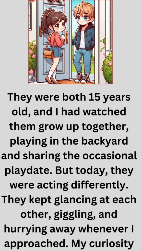 As a single mother, I often found myself caught up in the whirlwind of raising my daughter, Emma. Between work, household chores, and keeping up with her busy social life, I rarely had a moment to myself. But one sunny afternoon, as I was tidying up the living room, I couldn’t help but notice the strange behavior of Emma and our neighbor’s son, Ethan.They were both 15 years old, and I had watched them grow up together, playing in the backyard and sharing the occasional playdate. But today, they were acting differently. They kept glancing at each other, giggling, and hurrying away whenever I approached. My curiosity piqued, I decided to keep a closer eye on them.Over the next few days, I noticed their secret meetings and whispered conversations. They would sneak off to the park or hide in the treehouse, their heads bent together as they shared secrets and laughter. I couldn’t help but smile at the sight—it reminded me of my own first love, all those years ago.One afternoon, as I was watering the plants in the front yard, I saw them sitting on the porch swing, their hands intertwined. They were gazing into each other’s eyes, their faces mere inches apart. I held my breath, waiting to see what would happen next.Suddenly, Ethan leaned in and pressed his lips to Emma’s. It was a sweet, tentative kiss, but it was clear that they had both been waiting for that moment. I felt a rush of emotions—joy, nostalgia, and a touch of sadness at the realization that my little girl was growing up.As they pulled apart, both blushing furiously, I couldn’t help but chuckle to myself. I had been so caught up in the day-to-day of raising Emma that I had almost forgotten what it felt like to fall in love for the first time. Watching her experience that magic made my heart swell with pride and a touch of wistfulness.From that day on, I made a conscious effort to be more present in Emma’s life. I listened to her gush about Ethan, offering advice and a shoulder to lean on. I watched as their young love blossomed, and I couldn’t help but feel grateful for the role I had played in bringing them together.