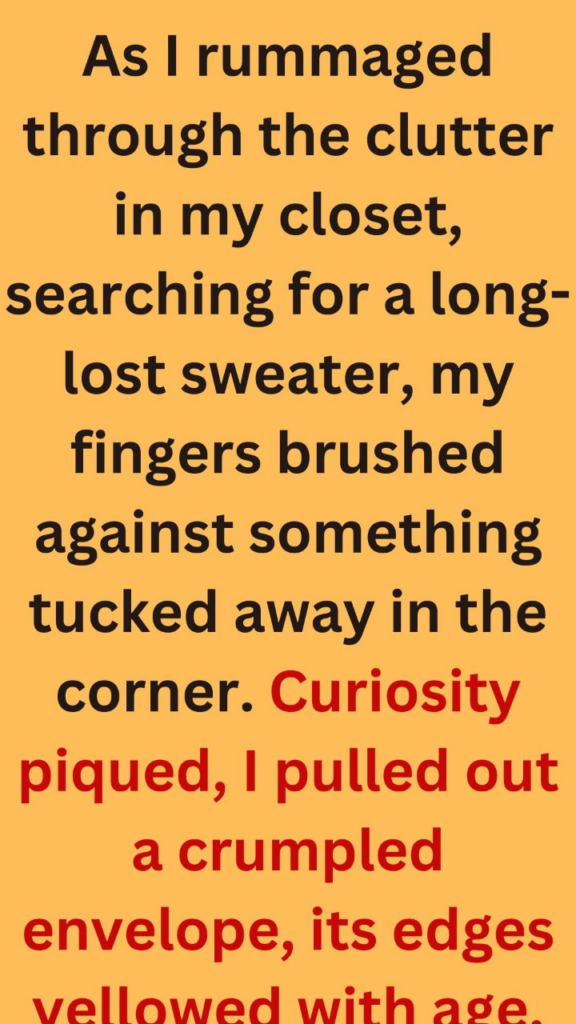 As I rummaged through the clutter in my closet, searching for a long-lost sweater, my fingers brushed against something tucked away in the corner. Curiosity piqued, I pulled out a crumpled envelope, its edges yellowed with age. My heart raced as I recognized the handwriting—my best friend, Alex.I sat on the floor, the weight of nostalgia heavy in the air, and carefully opened the envelope. Inside was a letter dated nearly a decade ago. As I began to read, my breath caught in my throat. The words spilled out like a confession I had never anticipated.