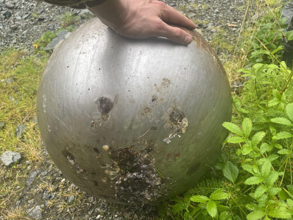 A metal sphere, about 16 inches wide, was found floating. It’s hollow with a weighted base attached by six welds, yet it floats high in the water.