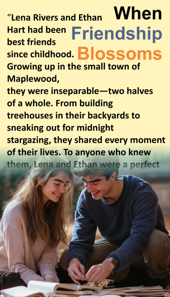 Lena Rivers and Ethan Hart had been best friends since childhood. Growing up in the small town of Maplewood, they were inseparable—two halves of a whole. From building treehouses in their backyards to sneaking out for midnight stargazing, they shared every moment of their lives. To anyone who knew them, Lena and Ethan were a perfect match, but they had always insisted that their bond was purely platonic.