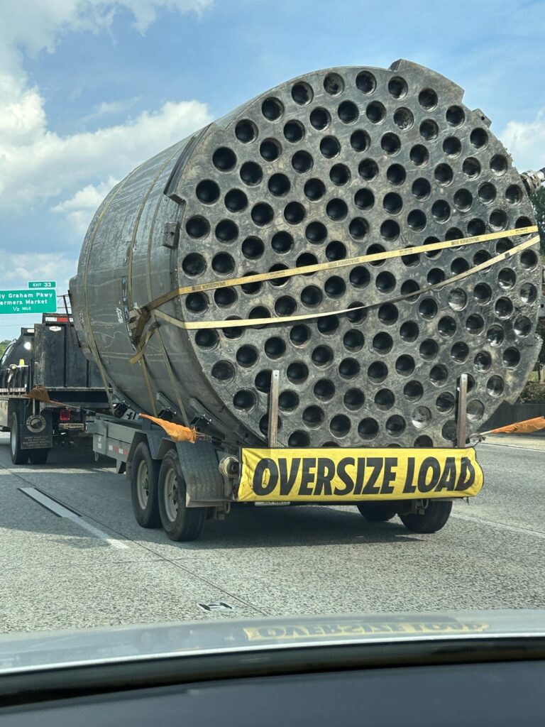 The object in the image appears to be a large heat exchanger, specifically the tube bundle portion of it. Heat exchangers are critical components in various industrial processes, particularly in the chemical, petrochemical, oil refining, and power generation industries. Key features: – Tube Bundle: The structure in the image has multiple holes, each of which would house a tube. In a heat exchanger, one fluid flows through these tubes, while another fluid flows around the tubes outside of them, facilitating heat exchange between the two fluids without mixing them. – Oversize Load: The “OVERSIZE LOAD” sign indicates that this is a large and heavy component, requiring special transport due to its size. Usage: – Heat Transfer: In a typical application, such as a power plant, this tube bundle would be used to transfer heat between steam and water, cooling or heating the fluids as required by the process. – Cooling Systems: In industries, these can be used to cool down high-temperature process streams by exchanging heat with cooler fluids. This specific equipment is likely being transported for installation or maintenance at an industrial site.