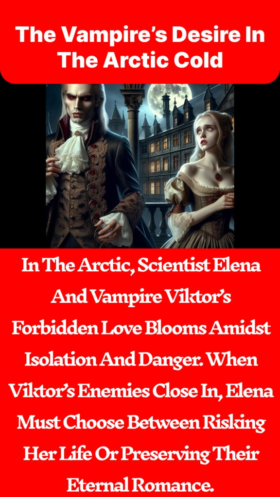 In the frozen expanse of the Arctic Circle, Dr. Elena Blackwood, a brilliant but isolated scientist, was researching climate change in a remote research station. At thirty-five, her life was marked by dedication and solitude. Her routine was upended when a mysterious stranger, Viktor Drazen, appeared in the midst of a blizzard. Viktor, an ageless vampire with a hauntingly beautiful presence, sought refuge in Elena’s research station, hiding from a rival faction. Their initial encounter was marked by suspicion and curiosity, as Viktor’s otherworldly aura intrigued Elena.