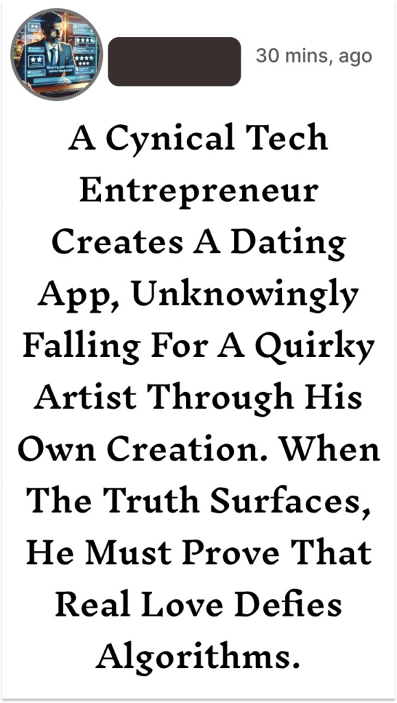 Max Carter, a cynical tech entrepreneur, had grown weary of love after too many failed relationships. Determined to prove that love could be algorithmically engineered, he created “Love, Inc.,” a dating app that promised to find your perfect match. Skeptical of the very thing he was selling, Max decided to test the app on himself, confident that it would fail him as much as real-life dating had. But when he matched with Chloe Bennett, a quirky artist who had never taken online dating seriously, his world began to shift in unexpected ways.