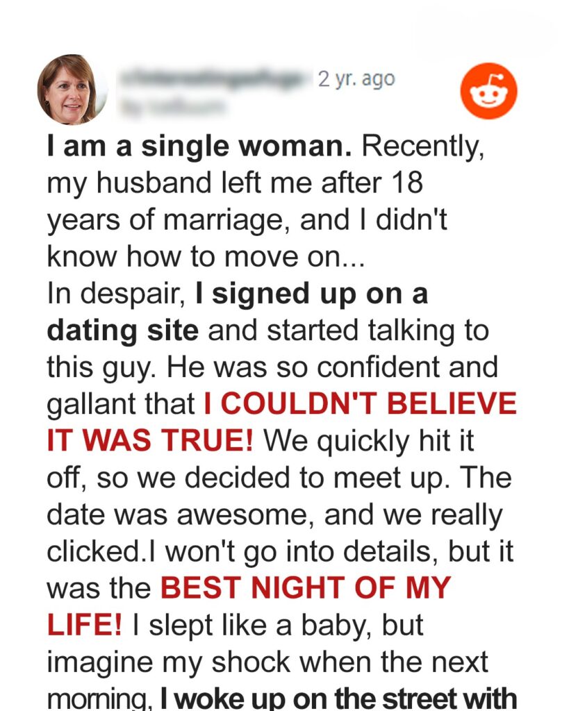 I felt like everything was going to turn out well, which gave me the courage to keep going. The drive felt endless, winding through narrow, unfamiliar roads. I watched the scenery change from the bustling city to quieter, rural landscapes.The further we drove, the more anxious I became. I couldn’t help but wonder if I was making a huge mistake. But I pushed those thoughts aside, reminding myself that I was here to take a chance on happiness.Finally, the taxi pulled up to a small apartment building. I paid the driver and stepped out, feeling a mixture of excitement and nerves. As I approached the building, I saw Juan just entering his apartment.“Juan! Surprise!” I called out, running towards him. I couldn’t wait to see his reaction. He looked very surprised, and for a moment, I thought he was upset to see me. But then he suddenly smiled, and my heart calmed down.“Oh, it’s you! I wasn’t expecting you! Why didn’t you text me about your visit?” “I’m sorry, I thought you would be happy to see me, Juan. You look so much better in person!” I said, trying to keep the mood light. “Yeah! You too… Lucy…” he said, hesitating slightly. “Lily…” I corrected him, feeling a pang of disappointment. He didn’t even remember my name. Maybe that was the first red flag I should have noticed.“Lily! Yeah, that’s what I meant. I’m sorry, sometimes American names are a bit confusing to me.” Maybe he was right, I thought. I shouldn’t be so negative. He was so handsome, and his accent made me want to listen to him more and more.“Lily! Yeah, that’s what I meant. I’m sorry, sometimes American names are a bit confusing to me.” Maybe he was right, I thought. I shouldn’t be so negative. He was so handsome, and his accent made me want to listen to him more and more.He invited me into his apartment, and we sat down to talk. The conversation flowed easily; before I knew it, we laughed and shared stories as if we had known each other for years. As the evening went on, we opened a bottle of wine. I felt my nerves melting away with each sip. Juan was charming and attentive, and I enjoyed his company more than I had expected.“So, what made you decide to come all the way here?” Juan asked, his eyes twinkling with curiosity. “I just needed a change,” I admitted. “After my husband left, I felt so lost. Talking to you made me feel hopeful again.” “I’m glad you came,” he said, his smile warm and reassuring. “It’s nice to meet you in person finally.”We continued talking late into the night, the wine loosening our tongues and deepening our connection. Eventually, exhaustion caught up with me, and I could barely keep my eyes open. “I think I need to get some sleep,” I said, stifling a yawn.“Of course, you must be tired from your trip,” Juan said, guiding me to a spare room. “Sleep well, Lily.” “Goodnight, Juan,” I said, smiling as I drifted off, feeling content and hopeful for the first time in a long while. But the next morning would bring a harsh reality I wasn’t prepared for. I woke up on the street, disoriented and confused. The sun was just beginning to rise, casting a soft light over the unfamiliar surroundings.My head throbbed, and I quickly realized that my phone and money were gone. I was left in my dirty clothes, feeling completely helpless.Panic set in as I looked around. People were starting their day, but no one seemed to notice me. I tried to speak to passersby, but my voice came out shaky and desperate. “Please help! Anybody!? Call the police!” I shouted, hoping someone would understand. But nobody did. They all glanced at me briefly before hurrying on their way, looking at me like I was homeless or worse. The language barrier was like a wall between me and any potential help. I felt a wave of hopelessness wash over me, and tears began to well up in my eyes.Just when I thought things couldn’t get any worse, a tall man approached me. He had a kind face and wore an apron, suggesting he worked at a nearby restaurant. He spoke to me in Spanish, and his words were rapid and hard to follow. I shook my head, trying to convey that I didn’t understand. He seemed to realize the problem and switched to broken English. “You… need help?” he asked, his voice gentle. “Yes, please,” I replied, my voice trembling. “I don’t have my phone or money. I don’t know what to do.” He nodded, his expression sympathetic. “Come… with me,” he said, gesturing for me to follow him. “I… Miguel.”“Lily,” I said, trying to manage a weak smile. I followed Miguel to a small, cozy restaurant just down the street. The aroma of freshly baked bread and coffee filled the air, momentarily distracting me from my fear. Miguel led me to a back room, where he handed me some clothes – a simple dress and a pair of shoes. “You… change,” he said, pointing to a small restroom. I nodded gratefully. “Thank you, Miguel.” I changed into clean clothes inside the restroom, feeling a little more human. I splashed some water on my face and looked at my reflection in the mirror. Despite the situation, I felt a flicker of hope. Miguel’s kindness was like a lifeline.When I came out, Miguel had prepared a plate of food for me. Eggs, toast, and a cup of hot coffee. He pointed to the chair, indicating I should sit and eat. “Eat… you need strength,” he said. I sat down and started to eat, the food filling the emptiness in my stomach. “Thank you,” I said again, my eyes welling up with gratitude. Miguel smiled and nodded. “You… use phone after.”As I finished eating, I couldn’t help but reflect on the events that had brought me here. Juan had seemed so perfect, but now it was clear he wasn’t who he pretended to be. The realization was painful, but Miguel’s unexpected kindness reminded me that there were still good people in the world.When I looked out into the hall to see how Miguel worked, I was stunned to see Ju