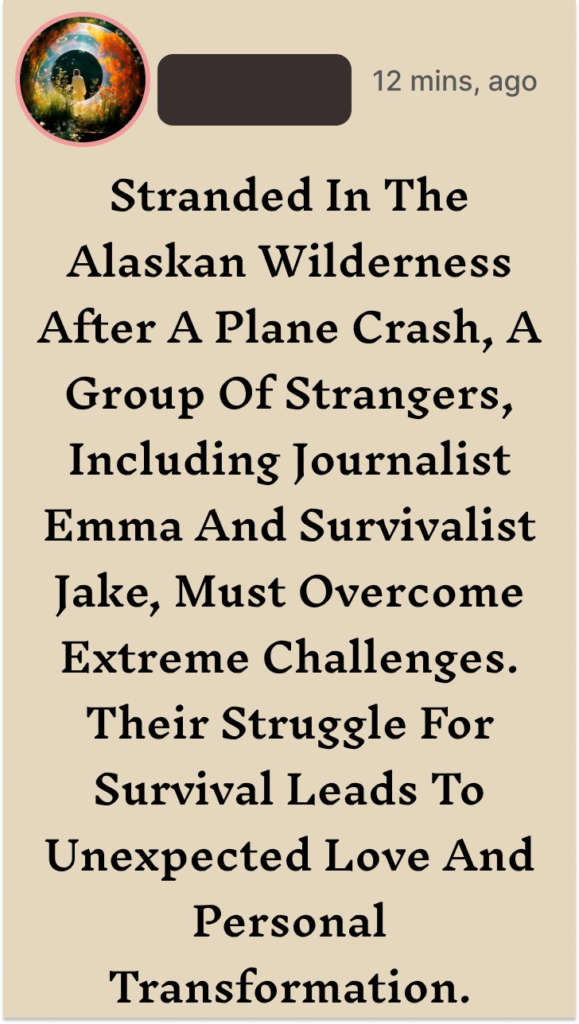 After their small plane crashes in the remote Alaskan wilderness, a group of strangers—including intrepid journalist Emma Carter, rugged survivalist Jake Donovan, and disheveled scientist Dr. Claire Bennett—must rely on each other to survive. Stranded without communication or supplies, they face extreme weather, treacherous terrain, and dwindling hope. Emma and Jake, initially at odds due to their contrasting approaches to survival, find themselves drawn together as they struggle to keep the group alive.
