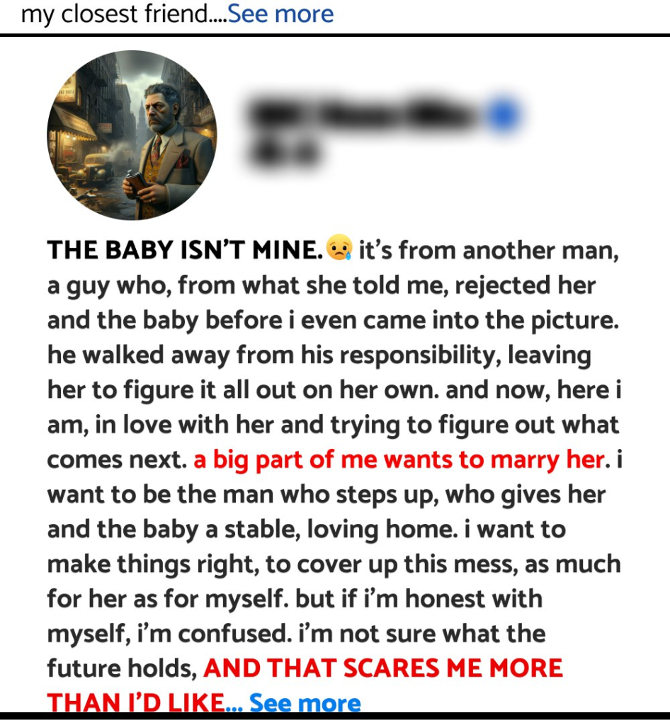 The baby isn’t mine. It’s from another man, a guy who, from what she told me, rejected her and the baby before I even came into the picture. He walked away from his responsibility, leaving her to figure it all out on her own. And now, here I am, in love with her and trying to figure out what comes next.
