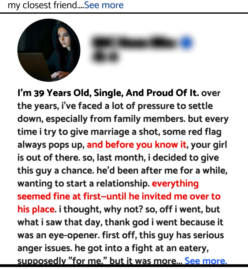 I’m 39 years old, single, and proud of it. Over the years, I’ve faced a lot of pressure to settle down, especially from family members. But every time I try to give marriage a shot, some red flag always pops up, and before you know it, your girl is out of there. So, last month, I decided to give this guy a chance. He’d been after me for a while, wanting to start a relationship. Everything seemed fine at first—until he invited me over to his place. I thought, why not? So, off I went, but what I saw that day, thank God I went because it was an eye-opener. First off, this guy has serious anger issues. He got into a fight at an eatery, supposedly “for me,” but it was more embarrassing than anything else. Then, while driving, he pointed out someone from the car, and when I leaned over to get a better look in the mirror, he shouted at me! Can you imagine? As if that wasn’t enough, he started trying to convince me that some ancestral powers were behind my late marriage and that he was the one who could save me from them. I couldn’t help but laugh inside—who does that? When we got to his place, the complaints started rolling in. He had a fit about where I put my slippers, and I quickly realized he was one of those perfectionists who has different slippers for each room—bathroom, kitchen, sitting room—you name it. Meanwhile, in my own house, I couldn’t care less where the slippers land. Within a day of staying with him, I knew there was no future for us. He shouted at every little thing. When it was time to sleep, he tried to get something out of me, but I wasn’t having it. I turned him down, and he held a grudge all night, even going so far as to pull away if I accidentally touched him. The next day, I cooked rice. Now, I usually decant my rice, but he complained, saying he doesn’t eat rice like that. I was like, “What am I supposed to do with it then?” He told me to add water and put it back on the stove. Seriously? I knew then and there that this wasn’t going to work. I had already told him I’m a mix of hot and cold—whatever you want, you’ll get—but I made it clear I don’t like being shouted at. Did he listen? Nope. I was ready to leave, praying the whole night that I’d make it home in one piece. But before I could go, he started nitpicking about the money I spent to buy something, implying that I was lying about the cost. That was the last straw. I hate being called a liar, so I let the lion in me roar. I shouted right back at him and demanded he drop me off. I didn’t even know the estate route, but I didn’t care—I knew I’d find my way. He dropped me off and had the nerve to say I’d beg him to come back. My sisters, I never called him back, not even once. Little did he know, I blocked him on all social media while still in his house before we even left. I just had to share this story with you all—hope I made you proud!