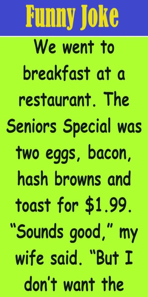 We went out for breakfast at a local spot. The Seniors Special included two eggs, bacon, hash browns, and toast for just $1.99.