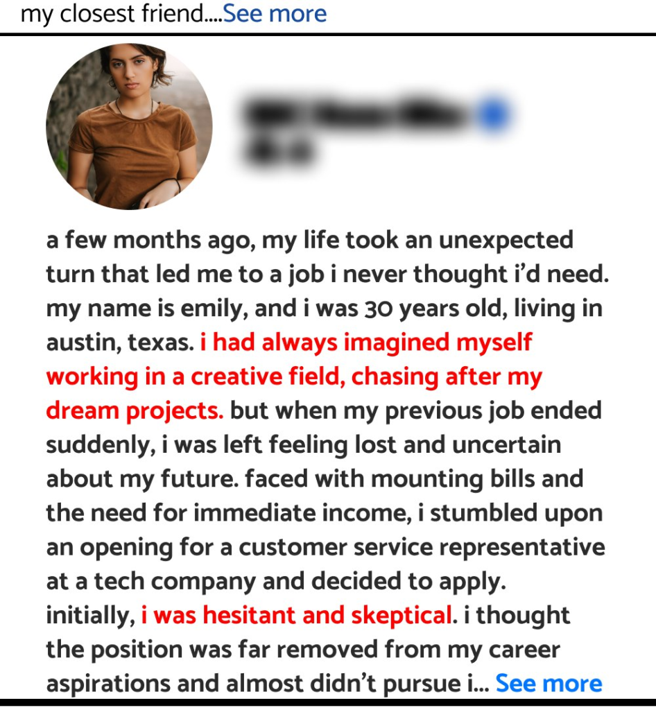 A few months ago, my life took an unexpected turn that led me to a job I never thought I’d need. My name is Emily, and I was 30 years old, living in Austin, Texas. I had always imagined myself working in a creative field, chasing after my dream projects. But when my previous job ended suddenly, I was left feeling lost and uncertain about my future. Faced with mounting bills and the need for immediate income, I stumbled upon an opening for a customer service representative at a tech company and decided to apply.