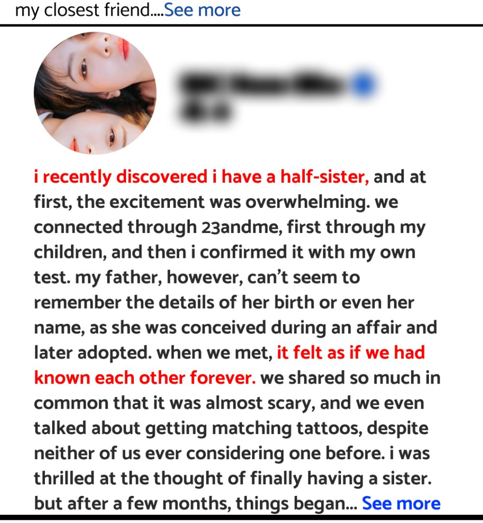 I recently discovered I have a half-sister, and at first, the excitement was overwhelming. We connected through 23andMe, first through my children, and then I confirmed it with my own test. My father, however, can’t seem to remember the details of her birth or even her name, as she was conceived during an affair and later adopted. When we met, it felt as if we had known each other forever. We shared so much in common that it was almost scary, and we even talked about getting matching tattoos, despite neither of us ever considering one before. I was thrilled at the thought of finally having a sister.