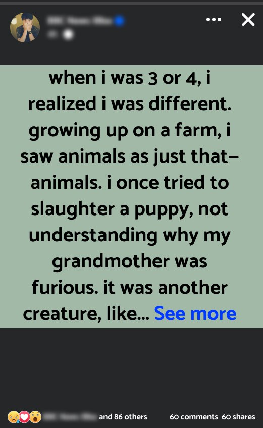 When I was 3 or 4, I realized I was different. Growing up on a farm, I saw animals as just that—animals. I once tried to slaughter a puppy, not understanding why my grandmother was furious. It was another creature, like the pigs we killed every year. My sister cried for the pigs, but I mimicked her, feeling nothing for their suffering. Emotions like empathy and fear never resonated with me, and I began learning how to manipulate the world around me. I learned crying got me what I wanted, and anger only brought trouble. By age 7, I was stealing cigarettes from my mom, enjoying the thrill of her scolding more than fearing it.