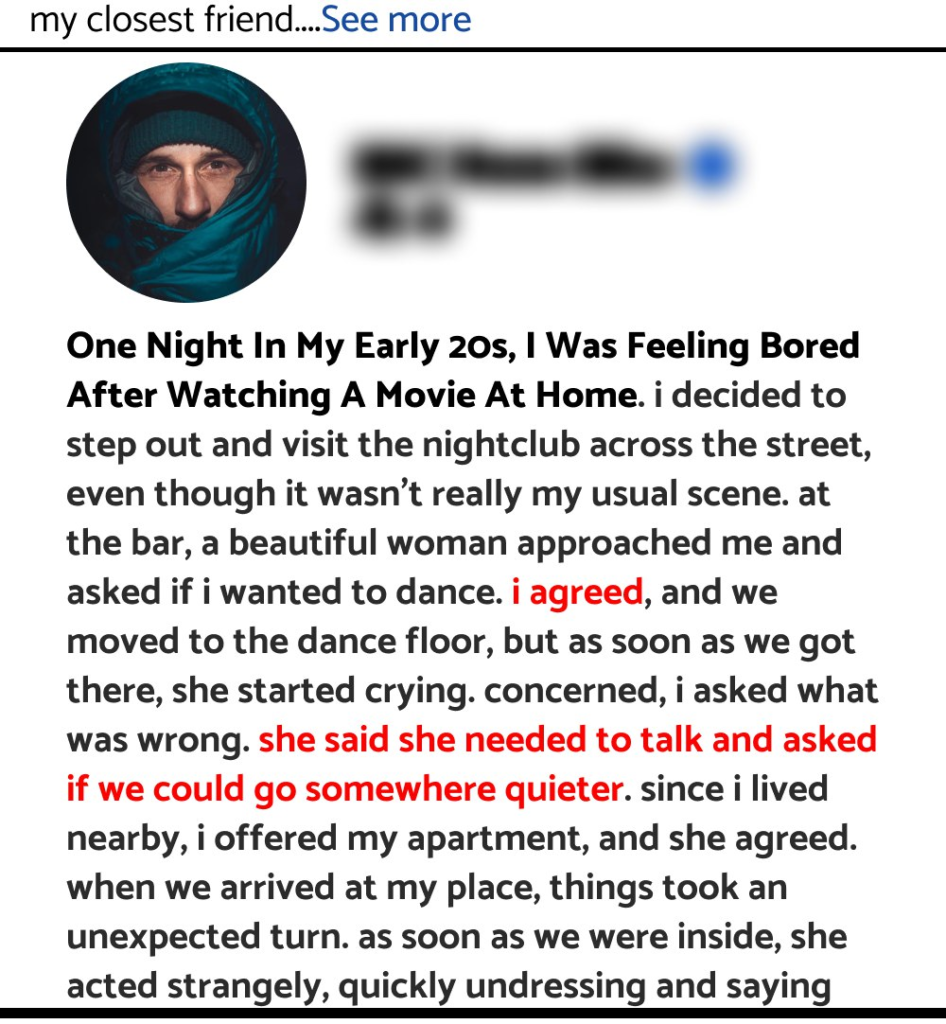One night in my early 20s, I was feeling bored after watching a movie at home. I decided to step out and visit the nightclub across the street, even though it wasn’t really my usual scene. At the bar, a beautiful woman approached me and asked if I wanted to dance. I agreed, and we moved to the dance floor, but as soon as we got there, she started crying. Concerned, I asked what was wrong. She said she needed to talk and asked if we could go somewhere quieter. Since I lived nearby, I offered my apartment, and she agreed.