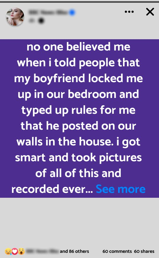EXPOSED ABUSE THROUGH HIDDEN RECORDINGS AND PHOTOS. No one believed me when I told people that my boyfriend locked me up in our bedroom and typed up rules for me that he posted on our walls in the house. I got smart and took pictures of all of this and recorded every fight we had without him knowing on a hidden phone. At the time, I had an infant son. Despite the isolation, I kept my evidence close, knowing it would be crucial in the future. After two years of being no contact… See more.