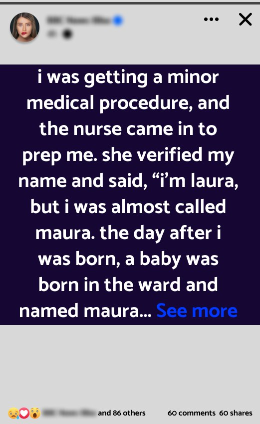 I was getting a minor medical procedure, and the nurse came in to prep me. She verified my name and said, “I’m Laura, but I was almost called Maura. The day after I was born, a baby was born in the ward and named Maura. My mother always said she wished she had known about that name sooner.”