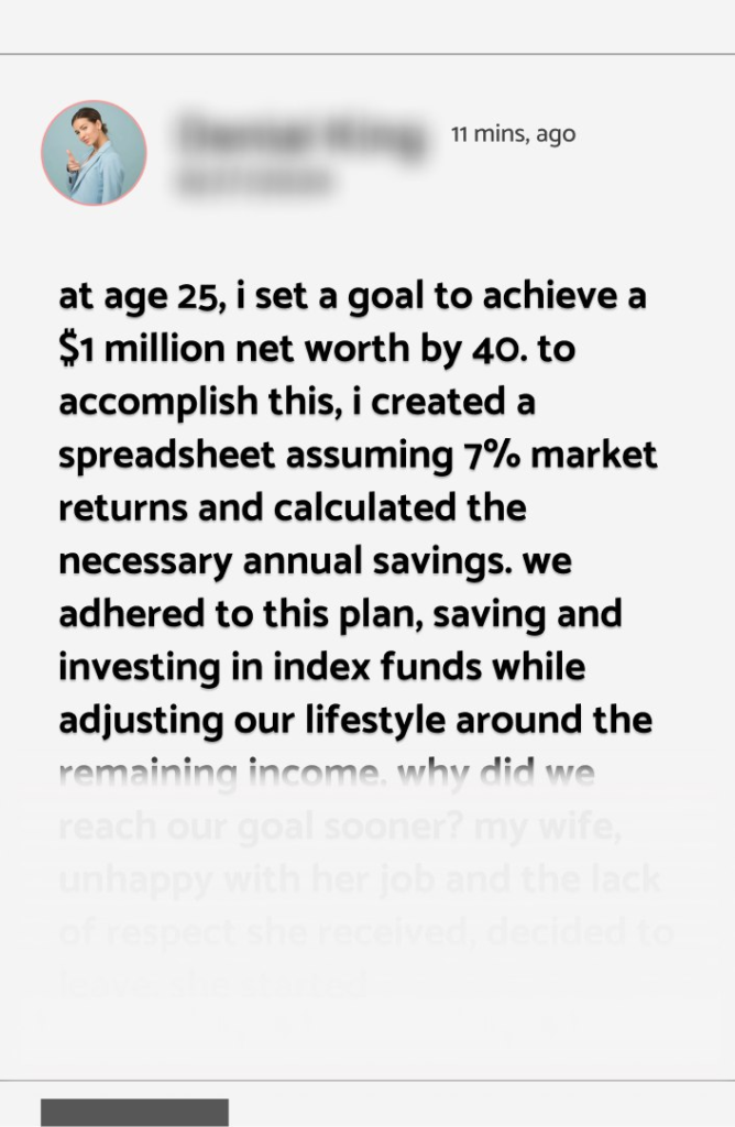 At age 25, I set a goal to achieve a $1 million net worth by 40. To accomplish this, I created a spreadsheet assuming 7% market returns and calculated the necessary annual savings. We adhered to this plan, saving and investing in index funds while adjusting our lifestyle around the remaining income.