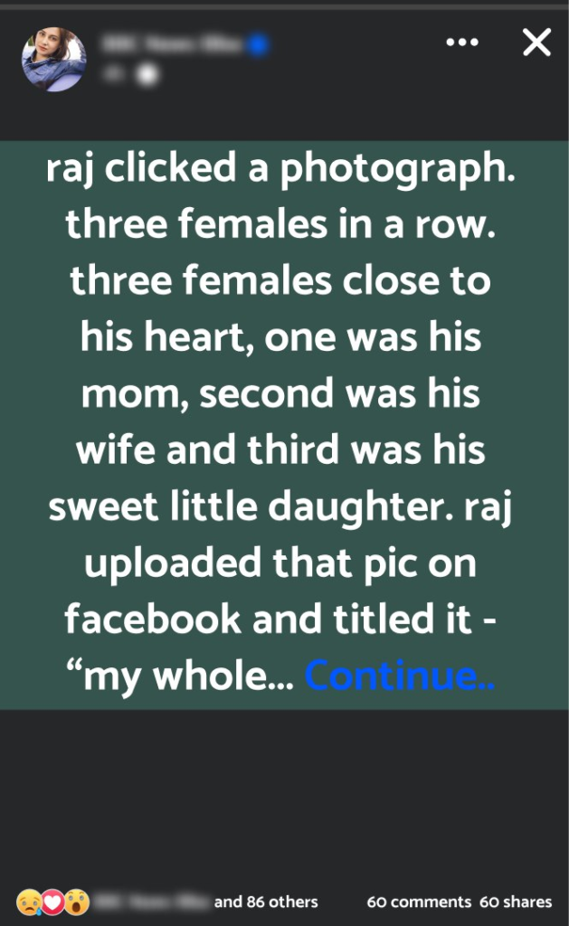 Raj clicked a photograph. Three females in a row. Three females close to his heart, one was his mom, second was his wife and third was his sweet little daughter. Raj uploaded that pic on Facebook and titled it – “My whole world in a pic!”