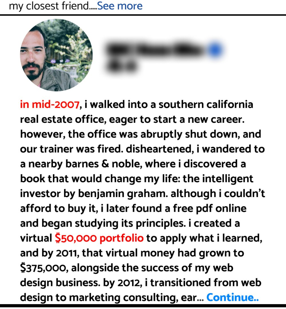 In mid-2007, I walked into a Southern California real estate office, eager to start a new career. However, the office was abruptly shut down, and our trainer was fired. Disheartened, I wandered to a nearby Barnes & Noble, where I discovered a book that would change my life: The Intelligent Investor by Benjamin Graham. Although I couldn’t afford to buy it, I later found a free PDF online and began studying its principles. I created a virtual $50,000 portfolio to apply what I learned, and by 2011, that virtual money had grown to $375,000, alongside the success of my web design business.