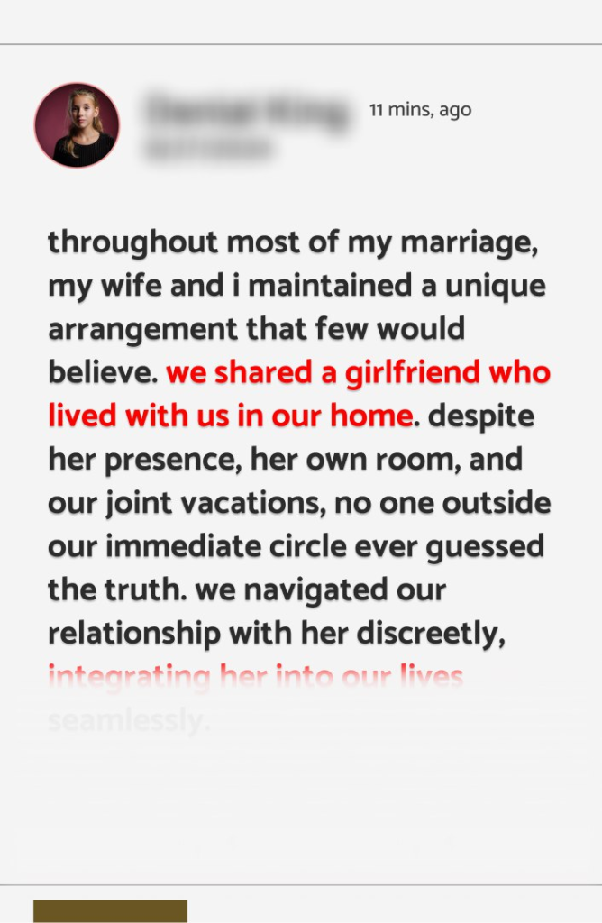 Throughout most of my marriage, my wife and I maintained a unique arrangement that few would believe. We shared a girlfriend who lived with us in our home. Despite her presence, her own room, and our joint vacations, no one outside our immediate circle ever guessed the truth. We navigated our relationship with her discreetly, integrating her into our lives seamlessly.
