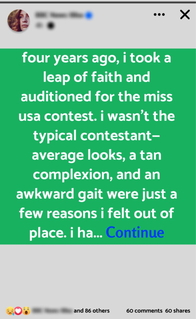 Four years ago, I took a leap of faith and auditioned for the Miss USA Contest. I wasn’t the typical contestant—average looks, a tan complexion, and an awkward gait were just a few reasons I felt out of place. I had never been into makeup or heels, and the world of beauty pageants seemed foreign. Yet, despite my hesitation, I found myself in a room full of anxious young women, wondering why I had even shown up.