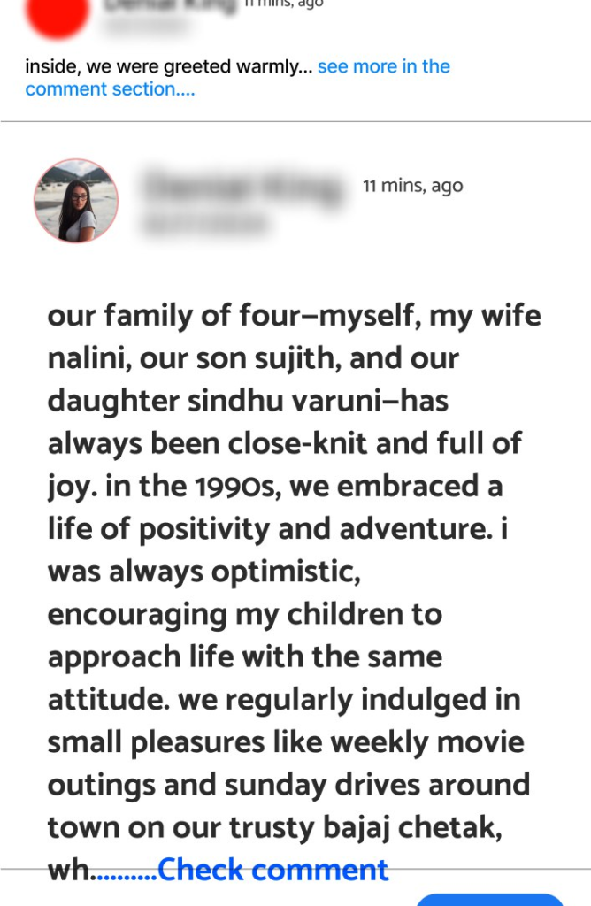 Our family of four—myself, my wife Nalini, our son Sujith, and our daughter Sindhu Varuni—has always been close-knit and full of joy. In the 1990s, we embraced a life of positivity and adventure. I was always optimistic, encouraging my children to approach life with the same attitude. We regularly indulged in small pleasures like weekly movie outings and Sunday drives around town on our trusty Bajaj Chetak, which, despite being a two-seater, often carried all four of us on its small frame. These simple yet meaningful activities created countless cherished memories that still warm our hearts.