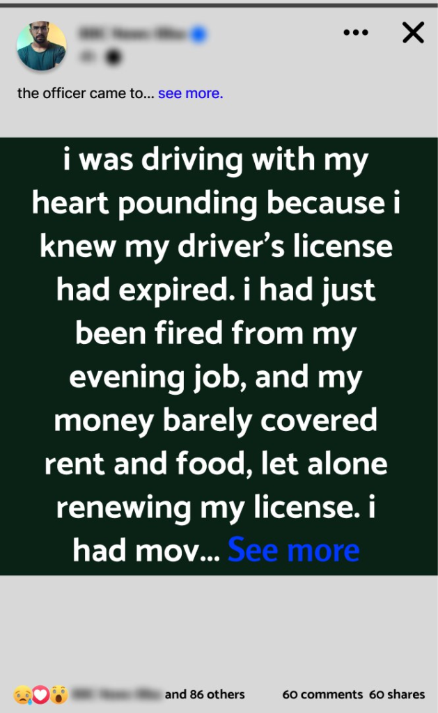 When we arrived, the officer even apologized to the interviewers for my being late, explaining that he had caused the delay. Thanks to him, I was accepted for the job. On top of that, I was granted a temporary driver’s license until I could afford to renew it. That officer showed me that sometimes, humanity and mercy go beyond the rules.