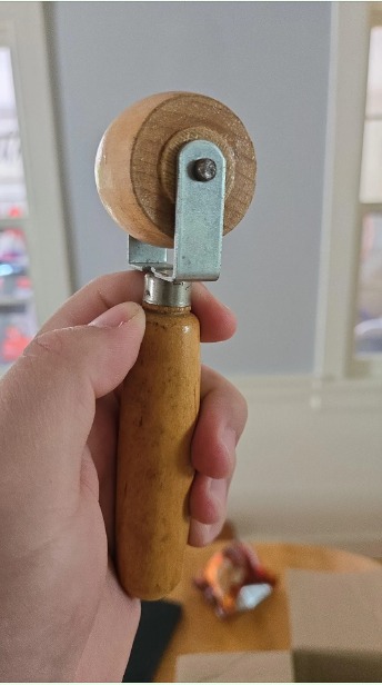 A wooden roller with a subtly curved surface and a brief wooden handle, found during a clean-up of an antique tool chest.