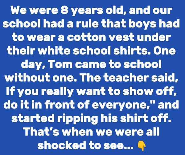 We were just 8 years old, and our school required boys to wear cotton vests under their white shirts. One day, Tom showed up without his vest. The teacher, noticing, said, “If you’re so eager to show off, do it in front of everyone,” and started ripping off his shirt. Shocked, we all stared as a bandage appeared on Tom’s lower back. It wasn’t alarming—just a small bandage, like the kind used for minor cuts. Everyone breathed a sigh of relief as the tension eased.