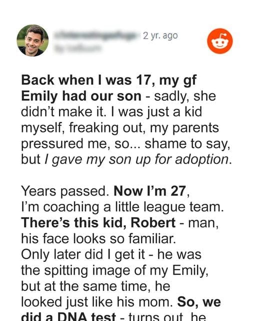 Teen Boy Puts His Newborn Son up for Adoption, Years Later He Accidentally Meets Him At 17, Daniel had to give up his newborn son for adoption due to his parents’ insistence. Years later, as a 27-year-old little league baseball coach, he encountered a new student, Robert, who bore a striking resemblance to his late girlfriend, Emily. Daniel, who had been coaching since leaving a teaching career, couldn’t shake off the feeling that Robert might be his son.Daniel and Emily had been young and unprepared for parenthood when Emily tragically died giving birth. Their son, whom Emily’s parents refused to accept, was given up for adoption on Daniel’s parents’ advice. Daniel, who had been coaching kids around the age his son would be, found himself constantly thinking about his decision.Upon noticing the uncanny resemblance to Emily in Robert, Daniel inquired with Robert’s mother, Nina, who revealed that Robert was adopted. After sharing his story with her, they agreed to a DNA test, which confirmed Robert was Daniel’s biological son. Nina, respecting her son’s right to know the truth, suggested they tell Robert and see if he wanted a relationship with Daniel.As time passed, not only did Robert and Daniel develop a bond, but Daniel also grew closer to Nina. Their relationship eventually turned romantic, and they decided to marry, giving Robert the complete family he had always wanted
