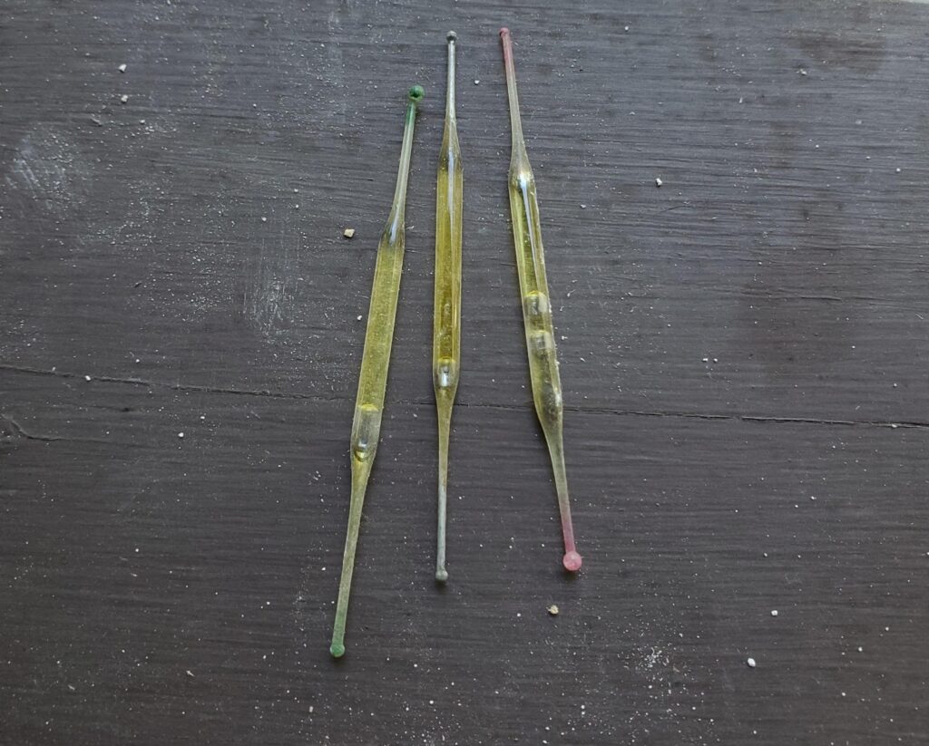 I found little glass tubes about 2 inches long, filled with liquid and featuring a colored glass ball at both ends.