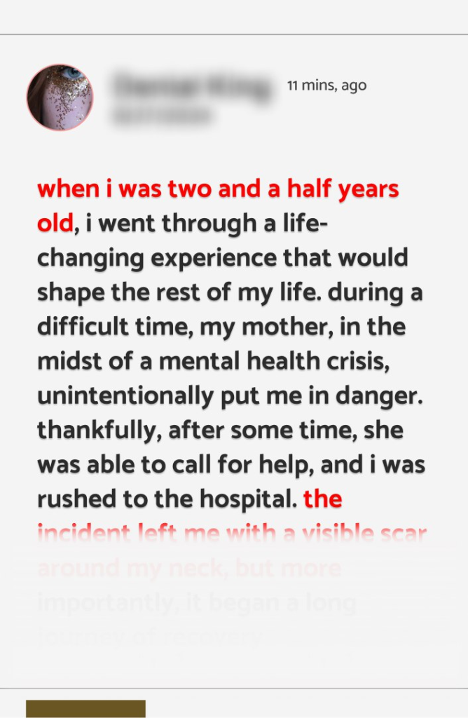 When I was two and a half years old, I went through a life-changing experience that would shape the rest of my life. During a difficult time, my mother, in the midst of a mental health crisis, unintentionally put me in danger. Thankfully, after some time, she was able to call for help, and I was rushed to the hospital. The incident left me with a visible scar around my neck, but more importantly, it began a long journey of recovery—both physically and emotionally.