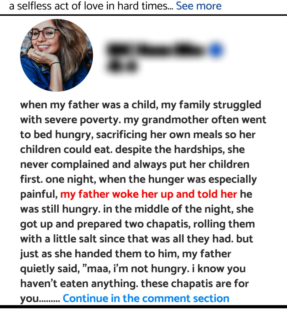 When my father was a child, my family struggled with severe poverty. My grandmother often went to bed hungry, sacrificing her own meals so her children could eat. Despite the hardships, she never complained and always put her children first. One night, when the hunger was especially painful, my father woke her up and told her he was still hungry.