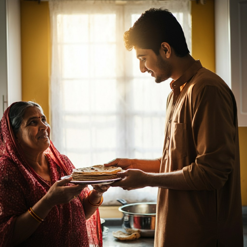 In the middle of the night, she got up and prepared two chapatis, rolling them with a little salt since that was all they had. But just as she handed them to him, my father quietly said, “Maa, I’m not hungry. I know you haven’t eaten anything. These chapatis are for you.” He had only pretended to be hungry so his mother could eat.