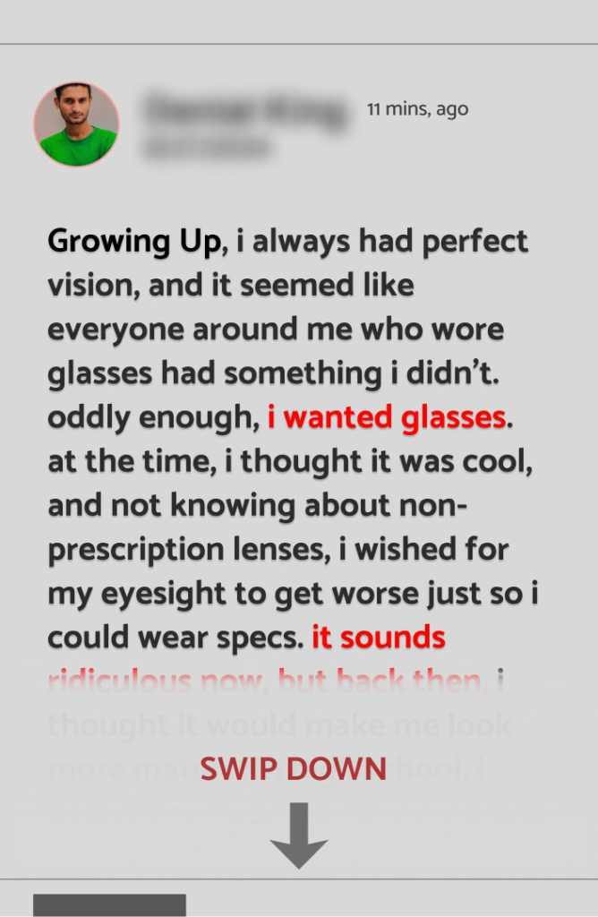 At first, it was exciting. I got my specs with a -0.25 prescription, not too bad, but enough to see distant objects more clearly. Over time, my eyesight worsened, and I became fully dependent on glasses. I wore them constantly, thinking I’d achieved what I wanted. That changed the day I tried contact lenses for the first time for a competition. When I put them in, it felt like I was seeing the world through my own eyes again, and I realized how beautiful the world really was. The glasses, despite helping me see, had always distorted reality a little, but with contacts, it was like I had perfect, God-given vision again.