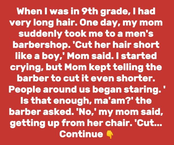 I started crying, but Mom insisted the barber go shorter. People began to stare. “Is that enough?” the barber asked. “No,” Mom said, standing up. “Cut mine just like hers.”