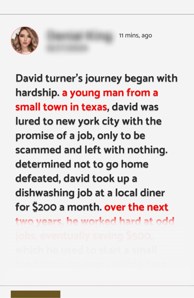 FROM PENNILESS TO POWERHOUSE: DAVID’S INCREDIBLE JOURNEY, David Turner’s journey began with hardship. A young man from a small town in Texas, David was lured to New York City with the promise of a job, only to be scammed and left with nothing. Determined not to go home defeated, David took up a dishwashing job at a local diner for $200 a month. Over the next two years, he worked hard at odd jobs, eventually saving $500, which he used to start a small food truck business selling breakfast burritos near a busy subway station……